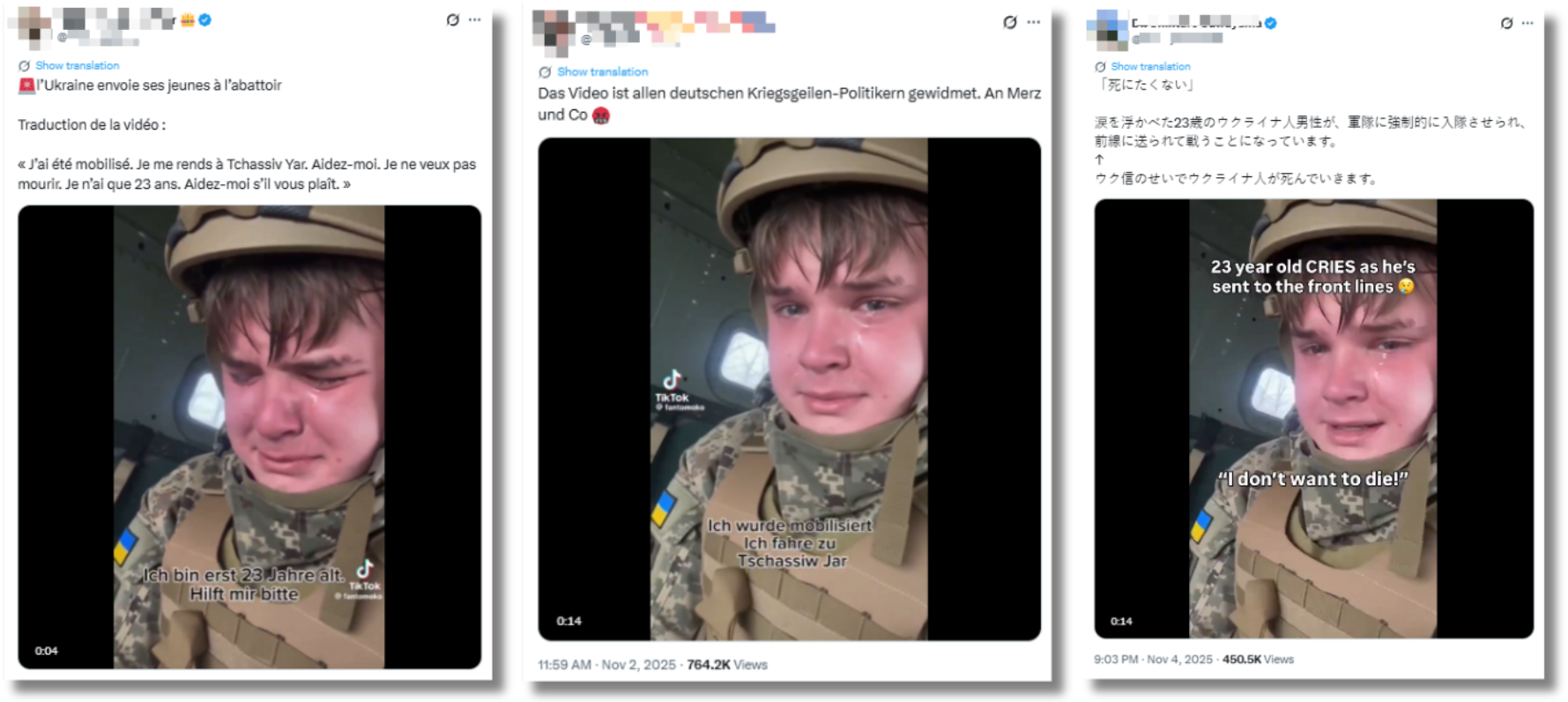 Una de las publicaciones con más visualizaciones es de Agencia Venezuela News, una página venezolana que comparte desinformación rusa de forma habitual, que ya acumula más de 710.000 visualizaciones en dos días. En ella comparte el vídeo junto al siguiente mensaje: “Ejército de Zelenski obliga a un joven de 23 años a subirse a una camioneta para ser enviado al frente, un hecho que evidencia la presión ejercida sobre los reclutas”. En realidad, en agosto de 2025, el Gobierno Ucraniano modificó la normativa para permitir que los varones de entre 18 y 22 años en condiciones de combatir pudieran salir del país (algo prohibido hasta entonces por la ley marcial que entró en vigor tras el comienzo de la invasión rusa hace más de tres años). Además, el servicio militar obligatorio en Ucrania se aplica a personas de entre 25 y 60 años, por lo que estaría exento de ser reclutado forzosamente.