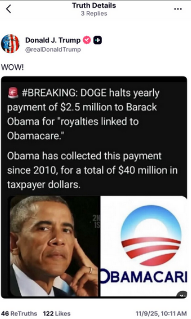 Mensajes virales señalan que Barack Obama lleva cobrando millones de euros desde 2010 por la ley conocida como Obamacare y que DOGE, iniciativa que tuvo al frente a Elon Musk, ha acabado con esos pagos anuales. Este contenido ha vuelto a circular después de que Donald Trump lo difundiera en la red social Truth Social el 11 de noviembre de 2025.