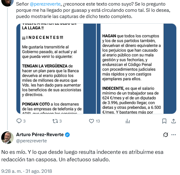 «Indecentes, texto de Arturo Pérez Reverte criticando a gobierno, empresas, políticos y diputados»