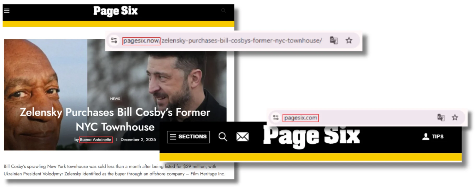 La página web que ha difundido este contenido utiliza un dominio similar al de la original (pagesix [.] now, en lugar de pagesix.com), además de la apariencia visual, para confundir a los usuarios. También firman el texto con el nombre de una periodista real que escribe en el medio estadounidense: Antoinette Bueno.