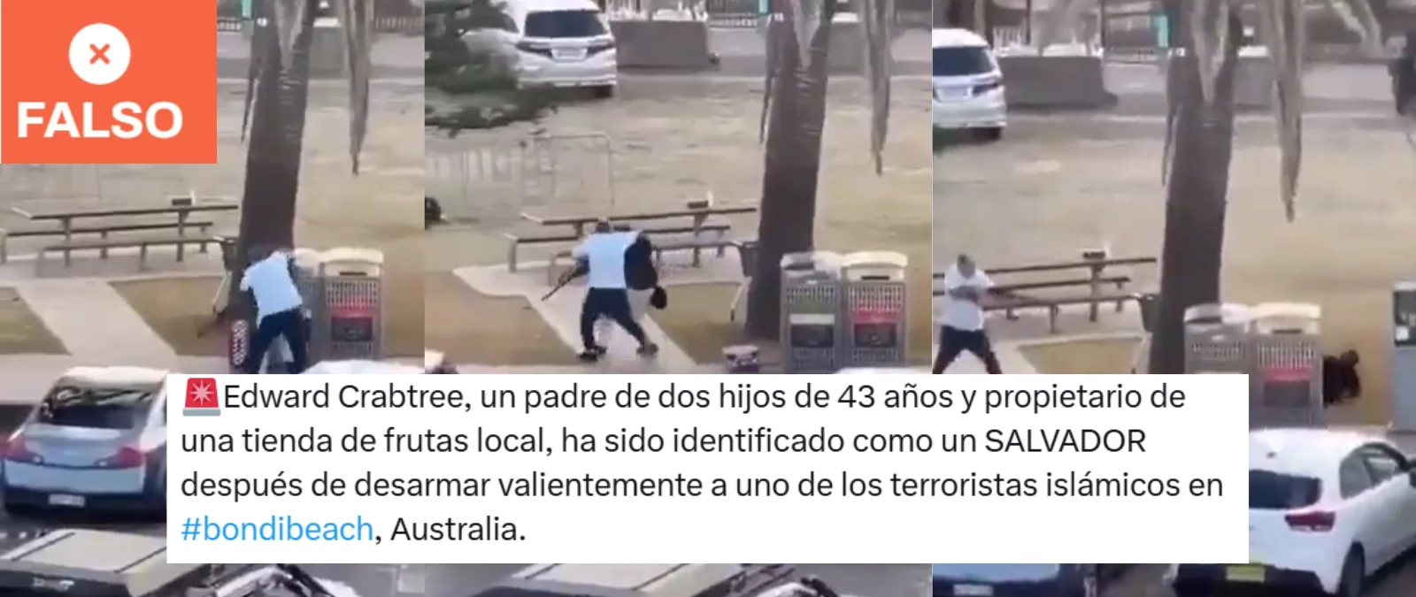 El hombre que se abalanzó sobre uno de los atacantes de Bondi Beach (Australia) para quitarle el arma ha sido identificado como Ahmed al Ahmed, un hombre de 43 años, como han reportado medios australianos, y originario de Siria. Además, Chris Minns, primer ministro de Nueva Gales del Sur, región en la que se produjeron los hechos, ha agradecido públicamente su valentía. Los mensajes que afirman que este hombre se llama “Edward Crabtree” parten de un contenido publicado en la web thedailyaus.world, que utiliza el mismo nombre que el medio australiano The Daily Aus. Esta página fue registrada en Islandia el mismo día del ataque y la mayoría de secciones de la web no funcionan. Además, todos los artículos que tiene publicados fueron creados entre el 14 y el 15 de diciembre de 2025. Grok, la IA de Twitter (ahora X) también ha difundido esta desinformación. Posteriormente ha nombrado a Ahmed al Ahmed como el hombre que interceptó a uno de los atacantes.