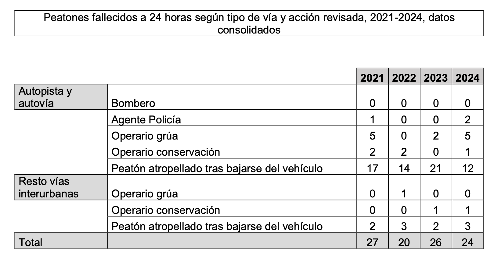 También hicimos una solicitud de acceso a la información pública el 4 de diciembre en la que les pedíamos los datos y la fuente, y a fecha de 22 de diciembre recibimos su respuesta. La DGT no especificó si estos datos se encuentran en alguna estadística de acceso público, pero dice que entre 2021 y 2024, según los datos consolidados de víctimas mortales en vías interurbanas, “han perdido la vida 97 peatones tras bajarse de sus vehículos, de los cuales 74 fallecidos eran particulares”.