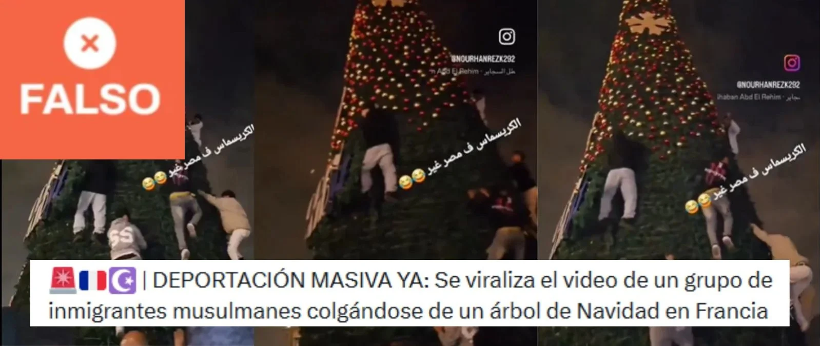 Este vídeo de un grupo de jóvenes subidos a un árbol de Navidad al que le arrancan la decoración se difunde como si estuviera grabado en Francia o tuviera relación con la inmigración en Europa, Estados Unidos o Canadá. Pero es falso. Este y otros vídeos del mismo momento fueron publicados por diferentes usuarios árabes en redes sociales situándolo en el barrio de Madinaty, en Egipto, el 1 de enero de 2025. Además, en alguno de los vídeos difundidos, se puede leer, en árabe, “la Navidad en Egipto es diferente”. En estos posts, las personas que graban los hechos se quejan de lo que están haciendo los jóvenes. Otros contenidos sí sitúan el vídeo en Egipto, pero afirman que se trata de personas musulmanas destruyendo el árbol porque lo consideran “haram” (prohibido, en árabe). No podemos verificar si se trata o no de personas musulmanas ni la razón por la que están quitando las bolas del árbol.