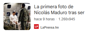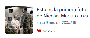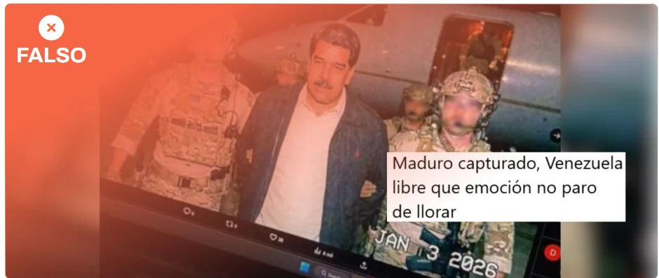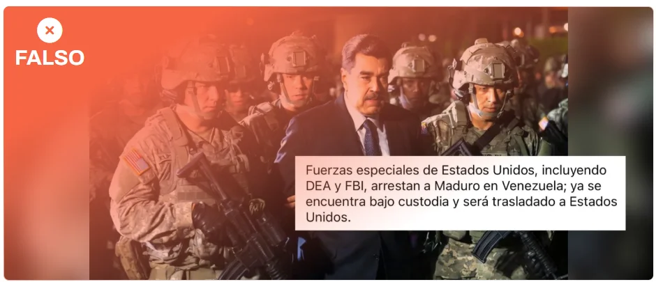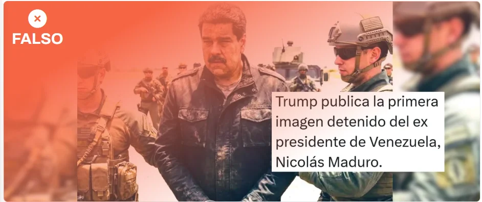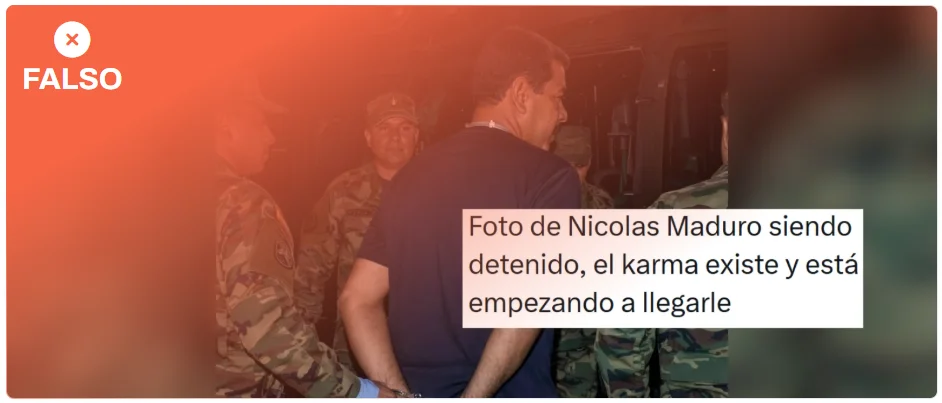 Esta imagen no es real: a las 13:50 horas del 3 de enero ningún medio ni el Gobierno de Estados Unidos habían publicado imágenes de la detención. Según ha publicado la televisión estadounidense CBS, fuentes que no identifica de oficiales del Ejército de Estados Unidos indicaron que le arrestó la Fuerza Delta, una unidad de élite antiterrorista del Ejército estadounidense, y no la Administración de Control de Drogas (DEA, por sus siglas en inglés). Según Verificado, miembro del IFCN como Maldita.es, ha sido creada con inteligencia artificial.