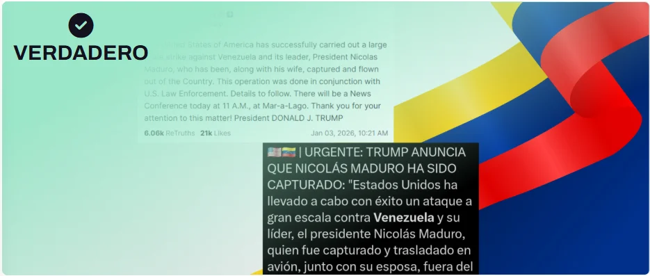 Esta imagen de Maduro esposado y detenido por militares no es real. Donald Trump publicó el 3 de enero una fotografía en su red social Truth Social de Maduro a bordo del buque militar USS Iwo Jima, donde se le puede ver con otra apariencia y vestido con chándal. Según ha publicado la televisión estadounidense CBS, sin identificar a las fuentes oficiales del Ejército de Estados Unidos, le arrestó la Fuerza Delta, una unidad de élite antiterrorista del Ejército estadounidense. Se han difundido imágenes falsas de la detención, donde sale con otra ropa y detenido por otras personas.