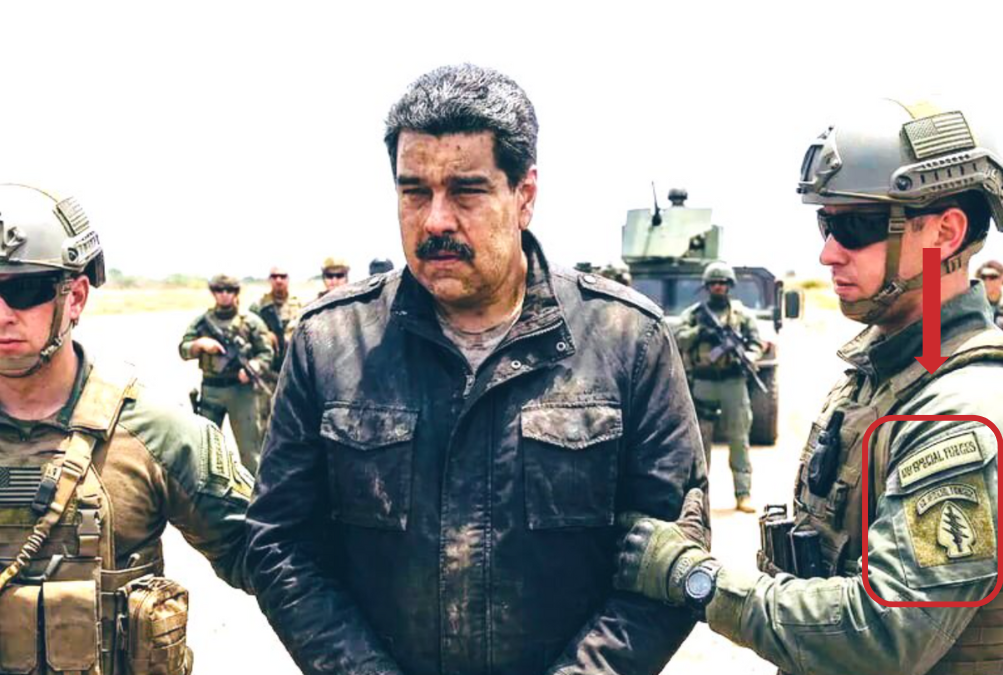 Esta imagen de la detención de Maduro no es real y no la ha publicado Donald Trump. Trump publicó el 3 de enero una fotografía en su red social Truth Social de Maduro a bordo del buque militar USS Iwo Jima, donde se le puede ver con otra apariencia y vestido con chándal. Según la televisión estadounidense CBS, mencionando fuentes que no identifica de oficiales del Ejército de Estados Unidos, indicaron que la detención la realizó la Fuerza Delta en “la madrugada del sábado” y no durante el día, como aparece en la imagen. Además, tiene signos de haberse creado con inteligencia artificial, como las letras ilegibles de las insignias del hombro de uno de los militares. Fotografía que difunden algunos contenidos donde se pueden apreciar elementos de IA.