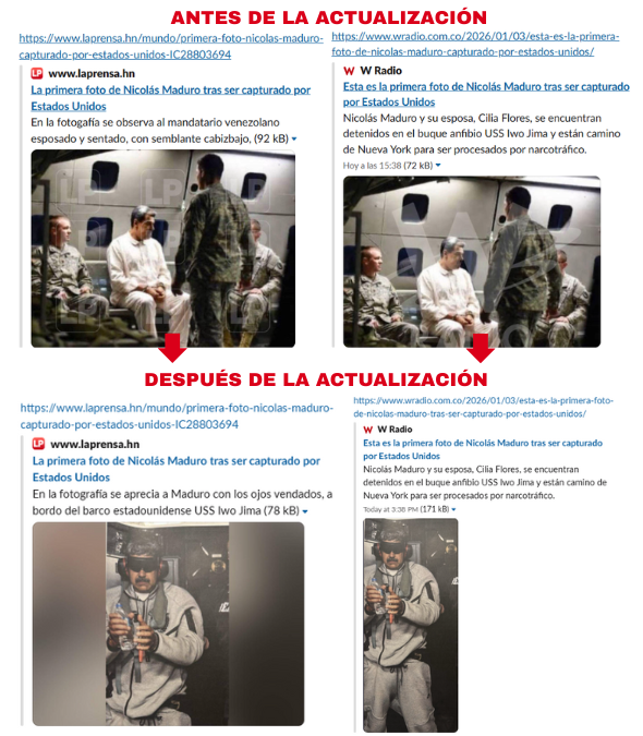 La imagen que han difundido varias publicaciones con Maduro detenido vestido con un pijama de color blanco no coincide con la publicada por Donald Trump el 3 de enero de 2026 en Truth Social, donde aparece vestido con un chándal de color gris. La imagen, difundida en ocasiones con la marca de agua de la emisora colombiana W Radio o La Prensa de Honduras, ha sido ya retirada de esas publicaciones tras actualizarse y recoger la publicada por Trump, tal y como se puede comprobar en previsualizaciones de mensajes internos del equipo de Maldita.es.