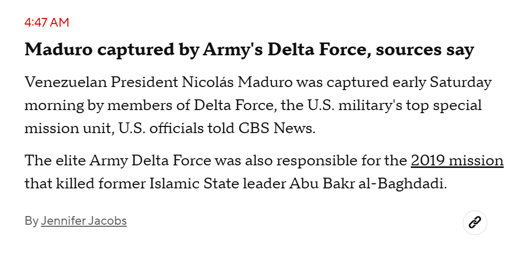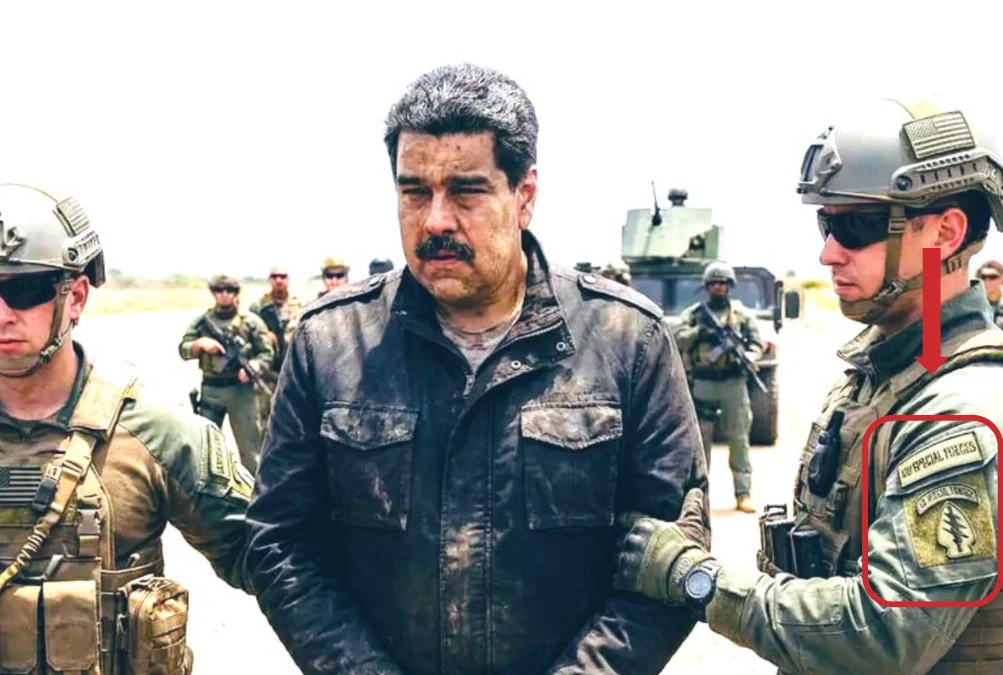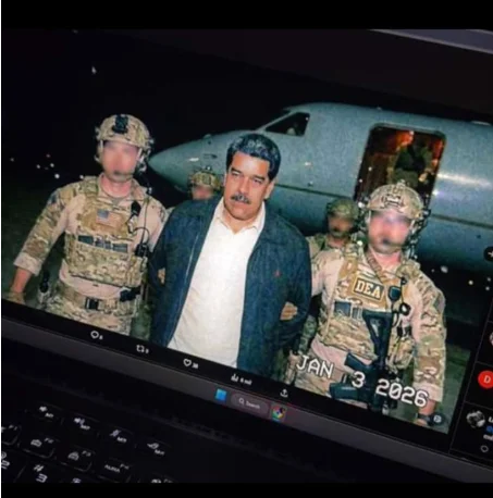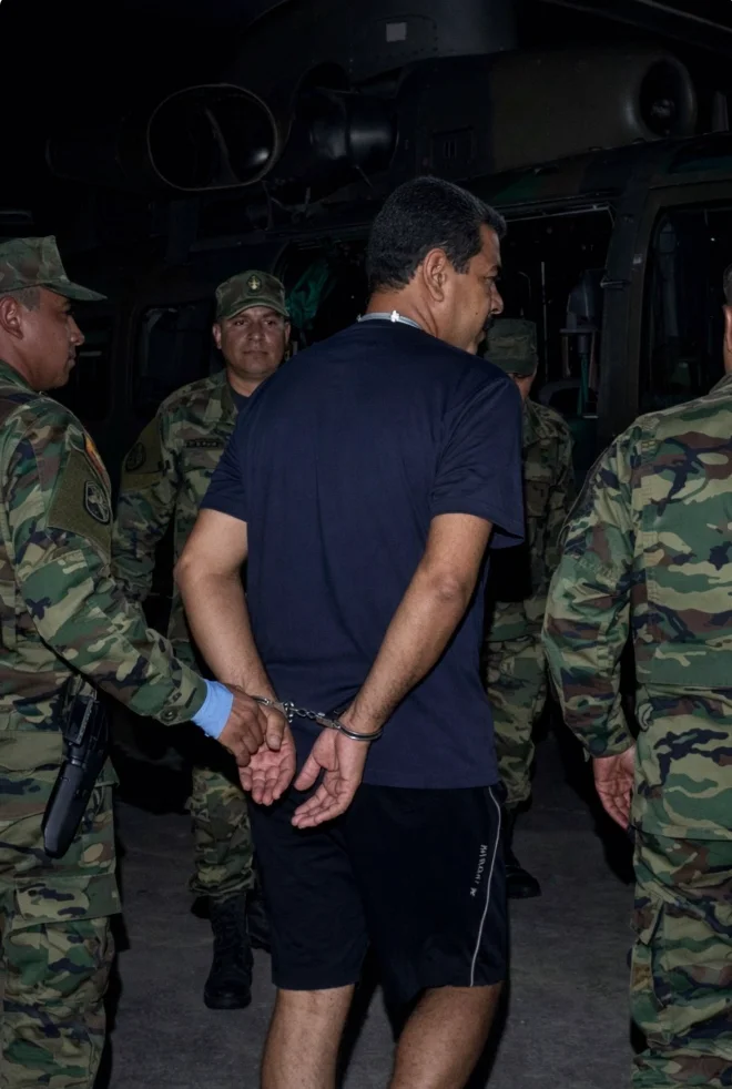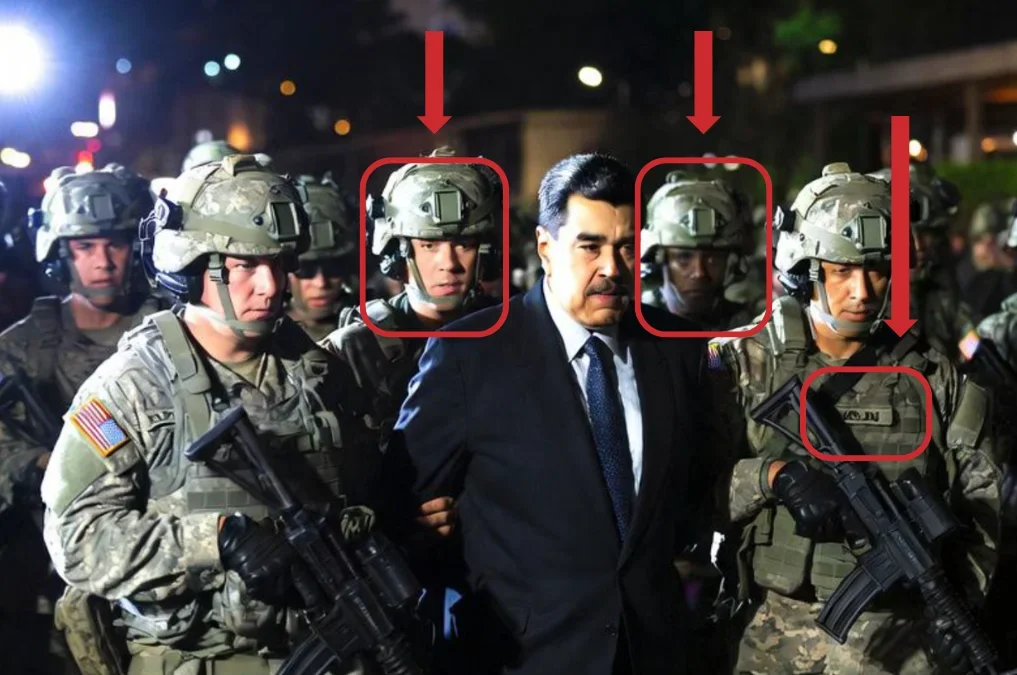 Esta imagen es una de las que más se viralizó en las primeras horas tras conocerse la detención. Según publicó la televisión estadounidense CBS, fuentes que no identificaba de oficiales del Ejército de Estados Unidos indicaron que le arrestó la Fuerza Delta, una unidad de élite antiterrorista del Ejército estadounidense, y no la Administración de Control de Drogas (DEA, por sus siglas en inglés), como muestran los supuestos uniformes de los agentes de la imagen. Según Verificado, miembro del IFCN como Maldita.es, ha sido creada con inteligencia artificial.