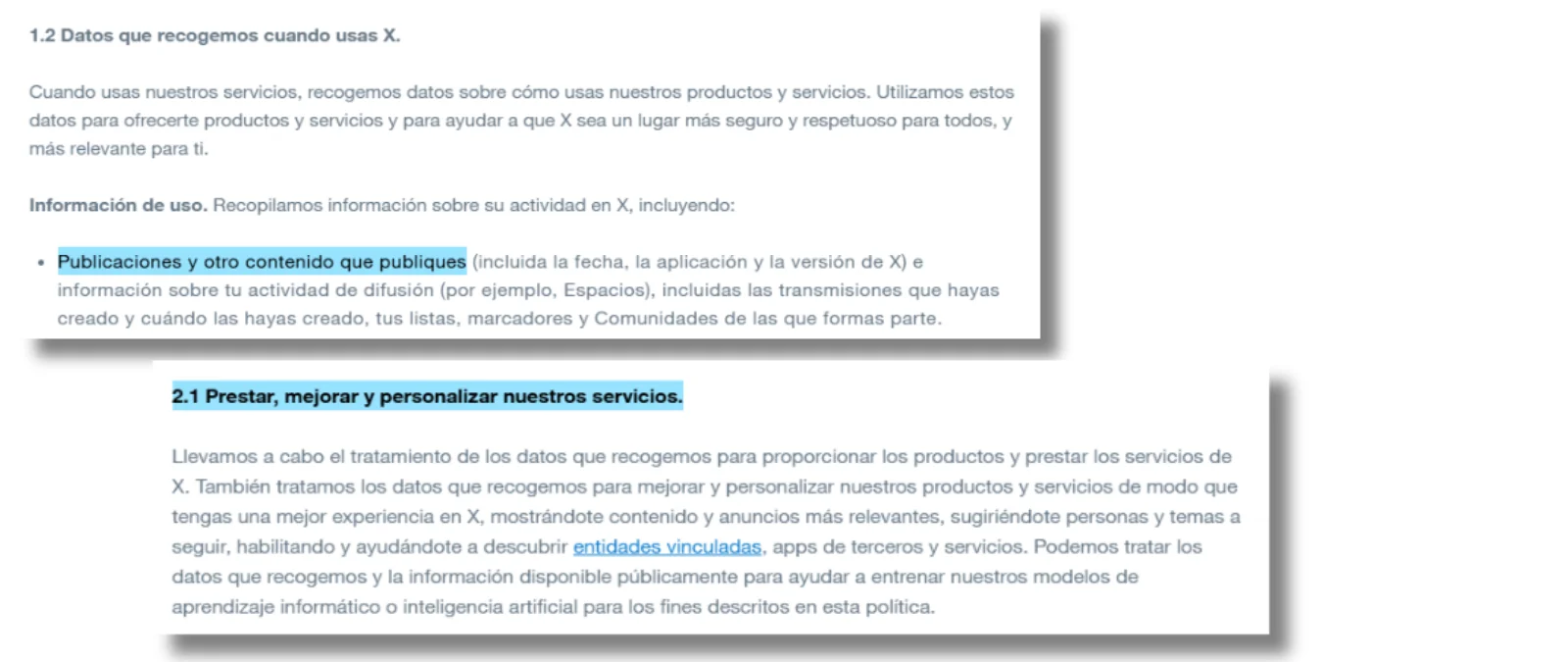 Samuel Parra, abogado especializado en derecho tecnológico, afirma que esta cadena no tiene validez legal y precisa que “al utilizar X aceptas sus términos y condiciones, que implican que la red social puede utilizar tu contenido y este se pueda editar con modelos de inteligencia artificial”. Así lo dice su Política de privacidad, donde la red social indica que recopila nuestras “publicaciones y otros contenidos”, y que estos se pueden usar para ”prestar, mejorar y personalizar” sus servicios.