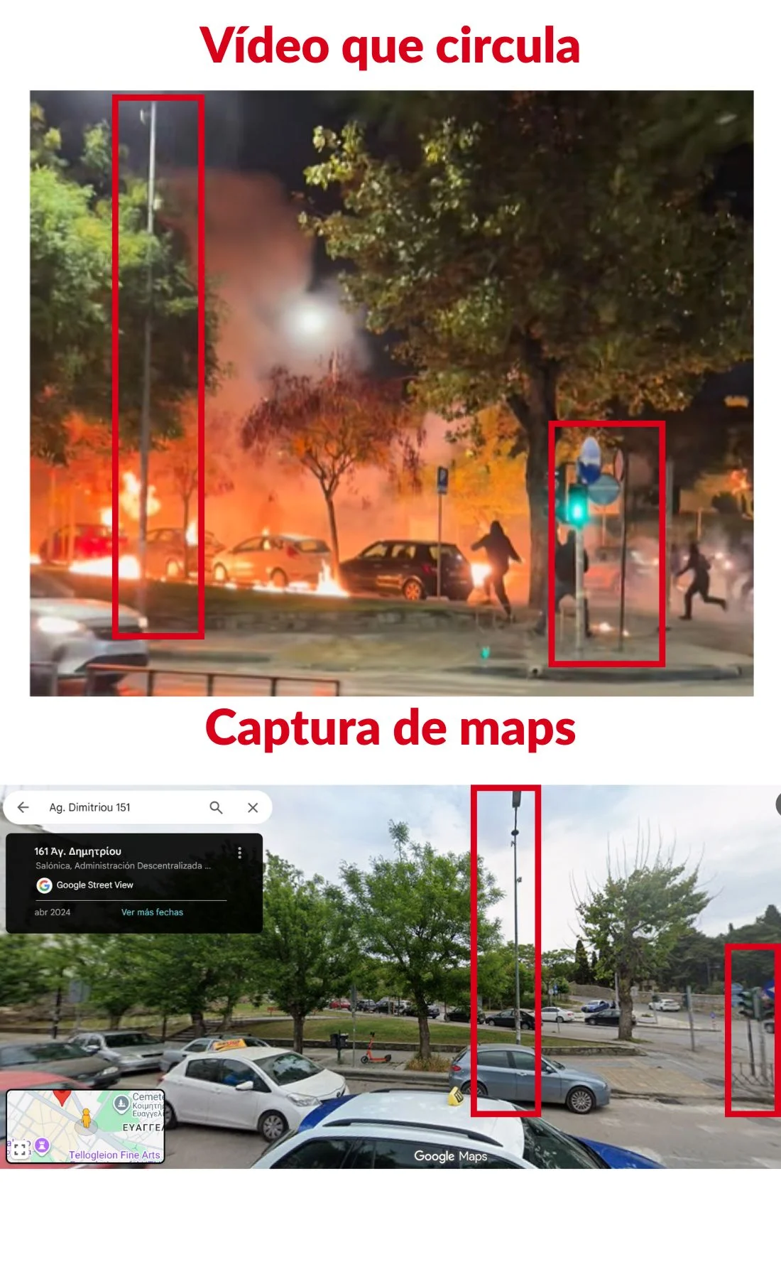 El vídeo que muestra incendios y personas lanzando cócteles molotov en la calle no pertenece a las protestas de enero de 2026. Una búsqueda inversa del vídeo da como resultado una publicación en TikTok del 1 de noviembre de 2025. En los comentarios se afirma que está grabado en Grecia, tras un concierto del rapero griego Lex en Salónica y a través de Google Maps se puede comprobar que coincide con una calle de la ciudad griega. Además, medios griegos se hicieron eco de lo sucedido, atribuyendo los disturbios a un grupo de individuos que atacó a las fuerzas policiales en las inmediaciones del Consulado turco en la ciudad del norte de Grecia.