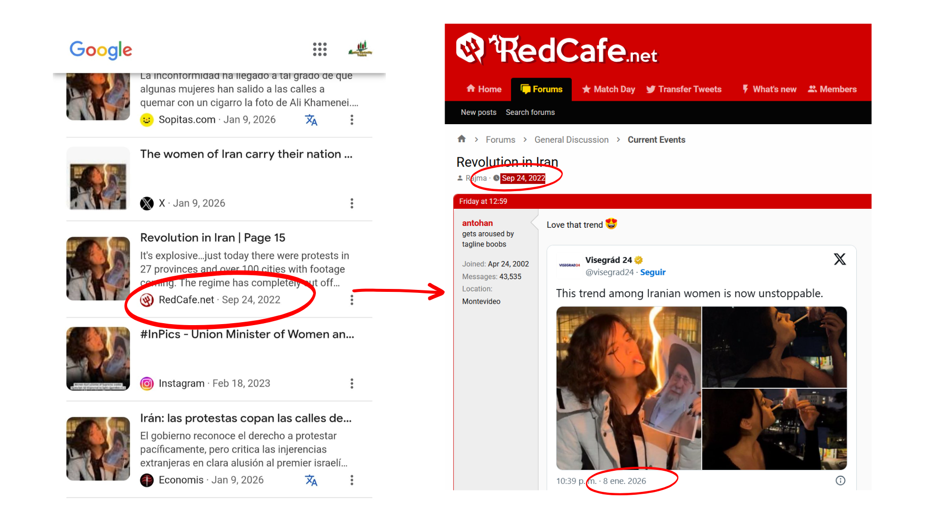 El vídeo de una mujer quemando una foto del ayatolá Jamenei y encendiéndose un cigarro con ella, del que también circula una captura, no es antiguo. Al realizar una búsqueda inversa, no encontramos registro de que la grabación se haya publicado antes del 7 de enero de 2026, al contrario de lo que aseguran algunas publicaciones. Como supuesta prueba de que la imagen es antigua, estos usuarios incluyen capturas de foros que tienen fecha de 2022, pero se trata de la fecha de creación del hilo, no de la publicación de la imagen. La propia protagonista de la grabación asegura en su perfil de Twitter (ahora X) que el vídeo se grabó el 7 de enero de 2026 y muestra los metadatos de la imagen. Aunque la grabación tenga lugar en Canadá, la usuaria lo difunde en el contexto de las protestas iraníes contra la República Islámica.