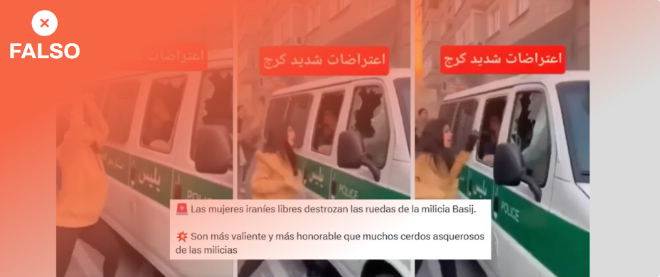 Este vídeo que supuestamente muestra a mujeres iraníes atacando un coche de la “milicia Basij” no es real, ha sido generado con inteligencia artificial (IA). Presenta varios errores habituales en los contenidos creados con IA. Es el caso de la persona que permanece inmóvil en la parte trasera del vehículo, a pesar de los cristales y los golpes. Además, durante los primeros segundos la ventana de la parte trasera no tiene cristales y aparecen para ser rotos por el bate. También se puede observar cómo la mayoría de utensilios que usan para golpear el vehículo no llegan a tocar la carrocería. En la grabación aparece el texto sobreimpreso en persa “Intensas protestas en Karaj”, pero no hay constancia de estas imágenes en los medios de comunicación que informan sobre las protestas actuales en Irán contra el régimen de los ayatolás.