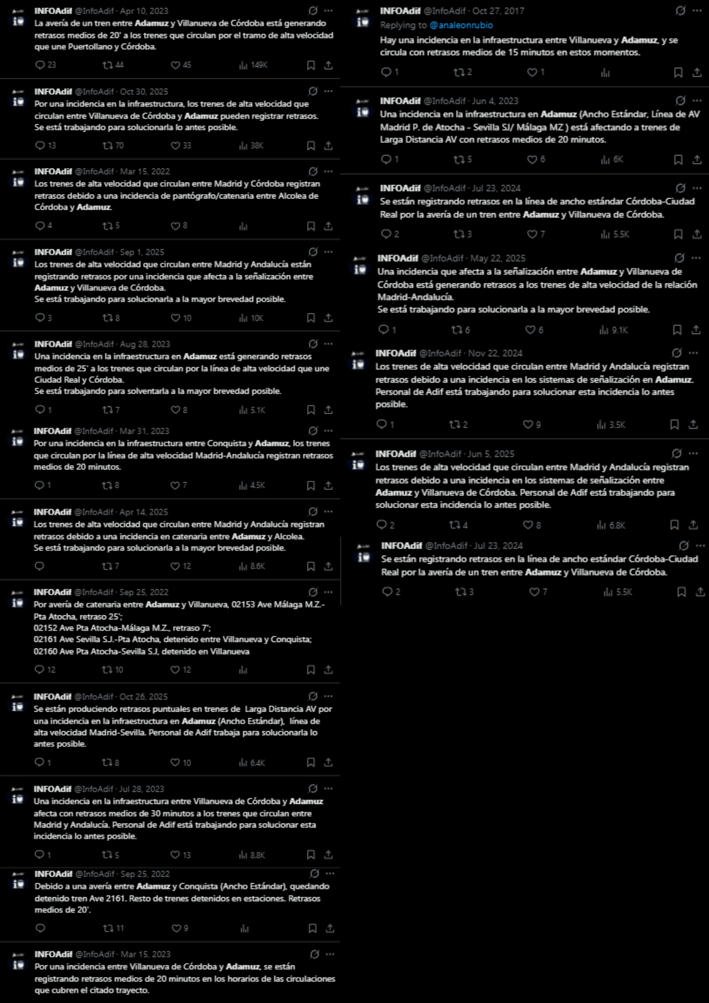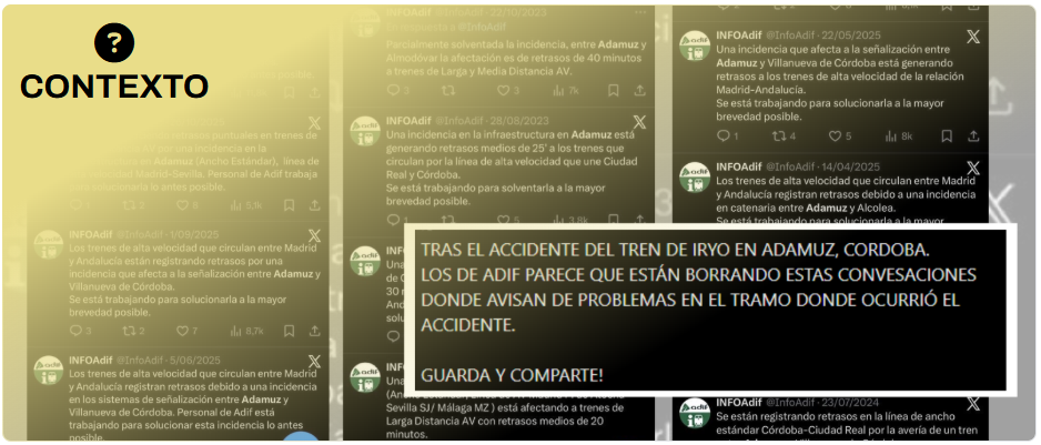A las 13:00 del 19 de enero de 2026, existen 19 tuits de la cuenta oficial de información de Adif avisando de “incidencias” o “averías” en Adamuz (Córdoba) anteriores al accidente ferroviario del 18 de enero. El primer tuit sobre una “incidencia de pantógrafo/catenaria entre Alcolea de Córdoba y Adamuz” es 2022, aunque ya en 2017 Adif respondió a una usuaria que había una “incidencia en la infraestructura entre Villanueva y Adamuz”. Contenidos publicados tras el accidente y acompañados de capturas de estos tuits afirman que Adif “parece que los está borrando”, pero a fecha de publicación de este artículo, todos los tuits que recogen en las capturas siguen publicados.