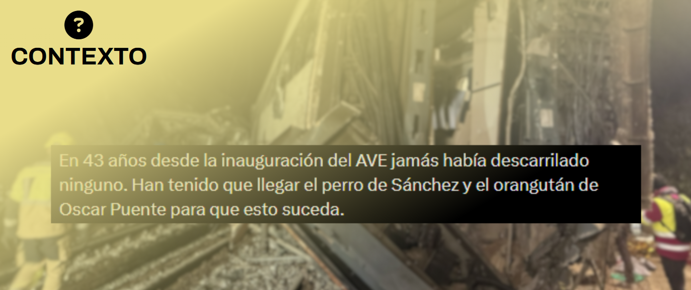 Los contenidos aseguran que el descarrilamiento de Adamuz es el primero desde la inauguración del AVE hace “43 años”, hasta ahora con el Gobierno de Pedro Sánchez. La primera circulación comercial del AVE Madrid-Sevilla tuvo lugar el 21 de abril de 1992, hace 34 años. El 12 de mayo de 2017 el tren AVE Sevilla/Málaga-Barcelona descarriló en un tramo entre Córdoba y Ciudad Real, en Brazatortas. En esa ocasión, 400 pasajeros se vieron afectados por el accidente, pero no hubo heridos o fallecidos. En la fecha en la que se produjo el incidente gobernaba Mariano Rajoy. El 24 de julio de 2013 se produjo un descarrilamiento de un tren Alvia, no AVE, en una curva pronunciada en Santiago de Compostela, en la línea Madrid-Ferrol, que dejó 79 fallecidos y 143 heridos.