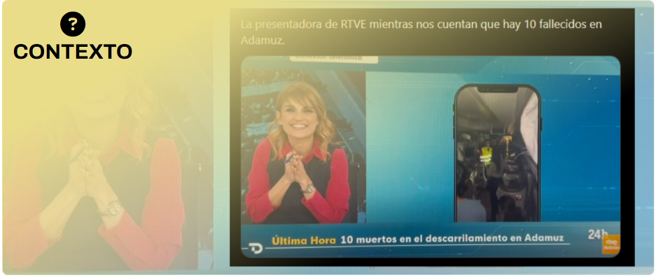 La imagen es real, pero no se trata del momento en que la presentadora de RTVE Lourdes Maldonado informa de que hay 10 fallecidos en Adamuz, sino de la conexión telefónica con “Ángel Valverde, vecino de la zona” en el minuto 44:10 del especial informativo sobre el accidente ferroviario de Adamuz de la 1 de RTVE. En ese instante, el vecino le dice a Lourdes Maldonado que espere “un momento” para hablar con una tercera persona y la presentadora responde: “Te vamos a dejar, Ángel, que estás muy solicitado y tienes que organizar todo ese dispositivo”, y sonríe.