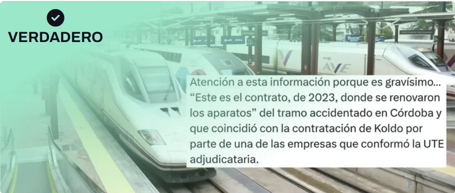 En abril de 2022, ADIF adjudicó la renovación y mejora del trazado del tramo de las vías [pág. 2] donde se ha producido el accidente de Adamuz (Córdoba) a una Unión Temporal de Empresas (UTE), un grupo de empresas que se presentan juntas a un concurso de contratación pública. El contrato, según ADIF, tenía un valor de 52.492.342,21 euros con impuestos. En el Portal de Contratación del Estado aparece con un valor de 53.269.314,76 euros con impuestos. En la UTE que se encargó de estas obras participó la constructora sevillana AZVI. Según El Confidencial y El Español, Koldo García fue asesor de esta empresa para la sección de Latinoamérica entre 2023 y diciembre de 2024, el momento de su detención. Según unas grabaciones en el marco de la investigación del caso Koldo, que recogen Servimedia, RTVE y The Objective, Koldo comentó con su mujer si podría hacer una factura a esta empresa sin contrato. En estas grabaciones no se menciona que las facturas estén relacionadas con la renovación del tramo accidentado. Maldita.es no puede verificar de forma independiente que haya relación con el accidente de Adamuz o que haya habido “corrupción” como apuntan algunos contenidos. Tampoco podemos verificar que las obras adjudicadas hayan estado relacionadas con el accidente ya que a 19 de enero de 2026 se están investigando las causas.