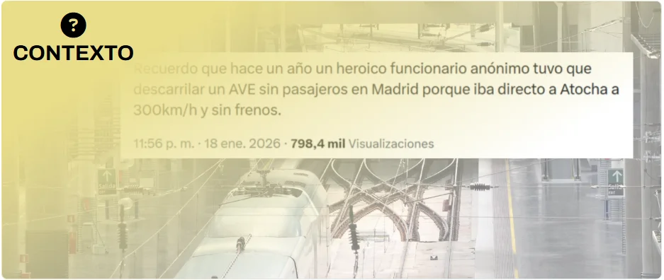 Tras el accidente de Adamuz se afirma que “hace un año” tuvo lugar en Madrid el descarrilamiento de un AVE que iba directo a Atocha a “300 km/h”, pero no es así. El incidente se produjo el 19 de octubre de 2024 y era un tren AVANT. El expediente del Ministerio de Transportes sobre este suceso detalla que el tren que descarriló estaba formado por “dos unidades del tren regional de alta velocidad serie 114”. Según explica Renfe en su página web, la Serie 114 son trenes con “una velocidad máxima comercial de 250km/h”, que coincide con el servicio de trenes de media distancia de Avant.