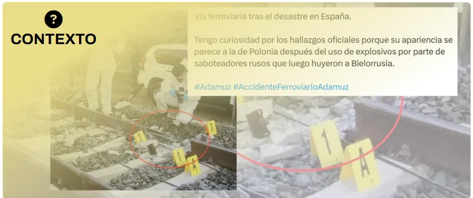 A 20 de enero de 2026 a las 18:00 horas el uso de explosivos no se ha mencionado como una de las posibles causas del accidente ferroviario en Adamuz por parte de las autoridades. En X (antiguo Twitter) comparten una imagen en la que aparecen varios agentes de la Guardia Civil inspeccionando la vía por donde circulaban los trenes y aseguran que “su apariencia se parece a la de Polonia después del uso de explosivos” por parte de Rusia, refiriéndose al incidente ocurrido en la línea férrea entre Varsovia y Lublin el pasado mes de noviembre al que su primer ministro denominó como “un sabotaje sin precedentes”. Respecto al accidente en España, la investigación sigue abierta y las causas del accidente todavía no se conocen. Además, el presidente de Renfe, Álvaro Fernández Heredia, considera que “es muy complicado tener una conclusión en un espacio breve de tiempo”.