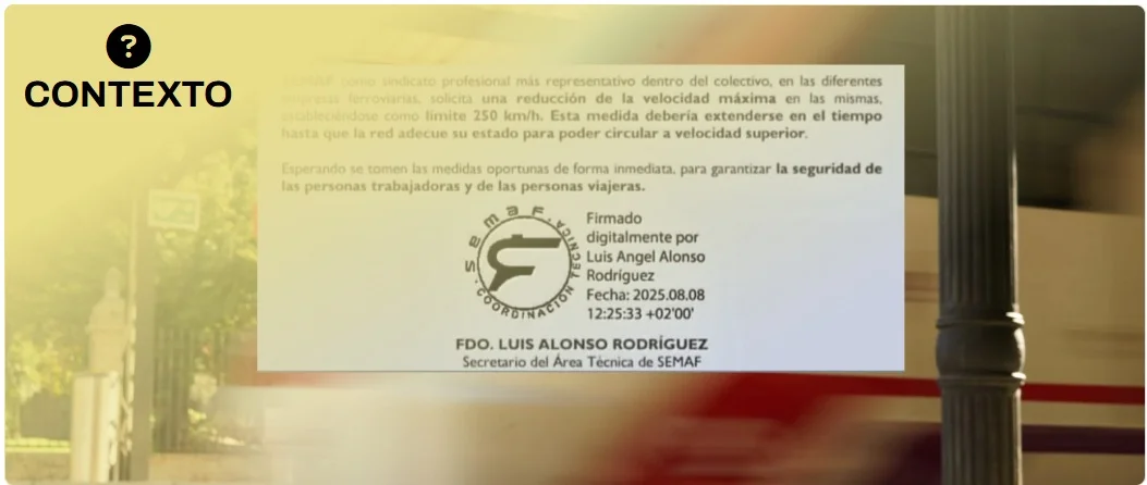 Desde SEMAF han respondido a Maldita.es que el comunicado que circula es real y que lo enviaron en agosto de 2025 a los destinatarios que aparecen en él. En el comunicado de SEMAF mencionan una “degradación profunda y acelerada en el material rodante” y desde este sindicato afirman a Maldita.es que el hecho de que haya un desgaste “implica inseguridad”, aunque pedían reducir la velocidad. El Comunicado también incluía la de petición de reducir la velocidad en algunas vías, incluida la 010 que une Madrid-Puerta de Atocha con Sevilla-Santa Justa de 300 km/h a 250 km/h en los tramos de la vía con ese límite, que no es el caso del tramo de Adamuz. El tramo de vía en el que se ha producido el accidente de Adamuz ya está limitado a 250 km/h, tal y como se puede comprobar en este mapa y como ha dicho el presidente de Renfe, Álvaro Fernández Heredia, a Cadena Ser.