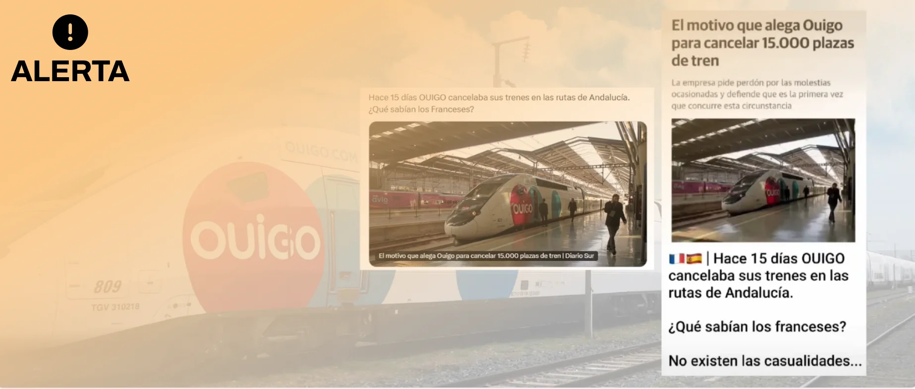 Los contenidos aseguran que Ouigo canceló sus trenes en las rutas de Andalucía porque sabía algo en relación al accidente. La empresa sí canceló varios trenes (pero no todos) entre el 9 y el 22 de enero en las rutas de Andalucía, diez días antes de que se produjera el accidente ferroviario en Adamuz, pero no hay ninguna prueba que indique que Ouigo canceló algunos de sus trenes en esa línea anticipando el accidente, como circula en redes sociales. En concreto, ocho servicios diarios de viernes a lunes y seis de martes a jueves en las rutas Madrid-Sevilla y Madrid-Málaga, por lo que seguía operando en estas rutas durante esas fechas pero con menor afluencia. La agencia de noticias Europa Press recoge un comunicado de la compañía francesa Ouigo en el que explica que estas cancelaciones se deben a la imposibilidad de contar con trenes suficientes para mantener esos servicios. Otros medios de comunicación como El País y Diario Sur también recogen las declaraciones de Ouigo para informar de que esta decisión ha afectado aproximadamente a 15.000 pasajeros.