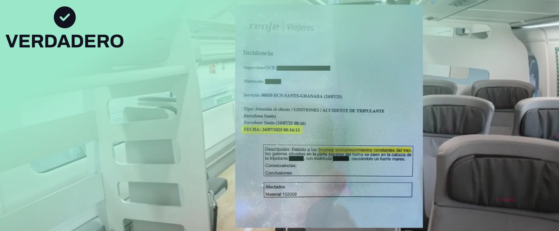 El 24 de julio de 2025 el supervisor del tren 00050 Barcelona-Granada comunicó que “debido a los bruscos saltos/movimientos constantes del tren, las gateras situadas en la parte superior del horno se caen en la cabeza de la tripulante X, con matrícula X, provocándole un fuerte mareo", según un parte al que afirma haber tenido acceso el diario El Mundo. Este medio afirma que Rafael Escudero, secretario general del Sindicato Ferroviario, dice que esto ocurrió a su paso por el tramo de Adamuz. En Maldita.es hemos contactado con Escudero y afirma que “el parte es verídico y es real” y que “lo hizo un afiliado” del sindicato. Además, ya te hemos contado lo que sabemos sobre el estado de las vías, como que en junio de 2025, el Gobierno respondió a varios senadores del PP en la que preguntaban por “la incidencia en los sistemas de señalización en la línea ferroviaria entre Adamuz y Villanueva de Córdoba” que provocó “que el 5 de junio [de 2025] hubiese retrasos en los trenes de alta velocidad”, que en esa ocasión hubo dos incidencias técnicas.