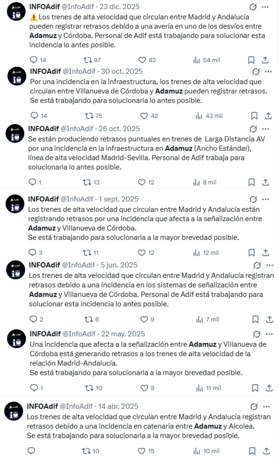 La primera de las incidencias fue registrada el 14 de abril entre “Adamuz y Alcolea”; la segunda el 22 de mayo entre “Adamuz y Villanueva de Córdoba”; la siguiente ocurrió el 5 de junio entre “Adamuz y Villanueva de Córdoba”, que realmente eran dos y fueron reconocidas en una respuesta escrita a dos senadores del PP; la siguiente se registró el 1 de septiembre entre “Adamuz y Villanueva de Córdoba”; el 26 de octubre hubo otra “incidencia en la infraestructura de Adamuz (ancho estándar), línea de alta velocidad Madrid- Sevilla”; el 30 de octubre sucedió otra entre “Villanueva de Córdoba y Adamuz” y el 23 de diciembre se informó de otra “avería en uno de los desvíos entre Adamuz y Córdoba”.