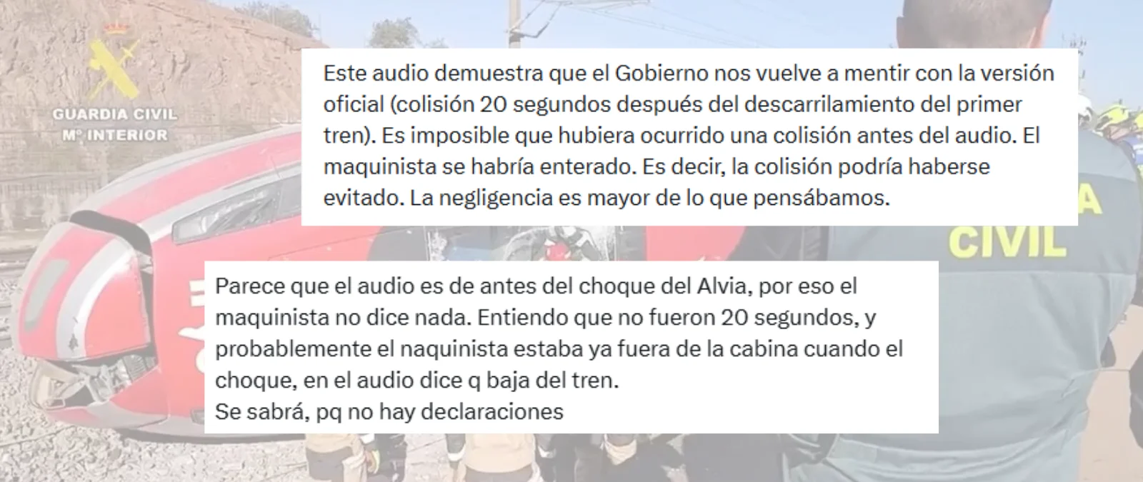 Ante la publicación de los audios, en redes sociales se ha afirmado que estas llamadas serían antes del choque y que eso demostraría que el Gobierno ha mentido cuando afirmó que hubo 20 segundos entre el descarrilamiento y el impacto. Sobre el momento en el que se produjeron estas conversaciones, elDiario.es dice que tienen lugar “instantes después del accidente” y que muestran que “el conductor no parecía consciente de haber colisionado con el Alvia que circulaba en la otra vía”.
