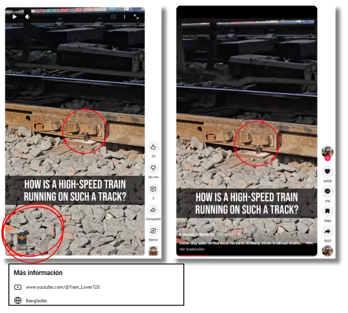 El vídeo, que se viraliza con mensajes como “España. Cuando un gobierno no cuida sus infraestructuras, vienen las desgracias” o “así están los raíles de trenes en España”, tiene la marca de agua de una cuenta de TikTok llamada @kenyan_railroader (ferroviario keniano, en español), lo que ha llevado a algunos usuarios a asegurar que es en Kenia, pero en realidad se trata de una versión recortada del original (donde no aparece la marca de agua de la cuenta de Bangladesh).