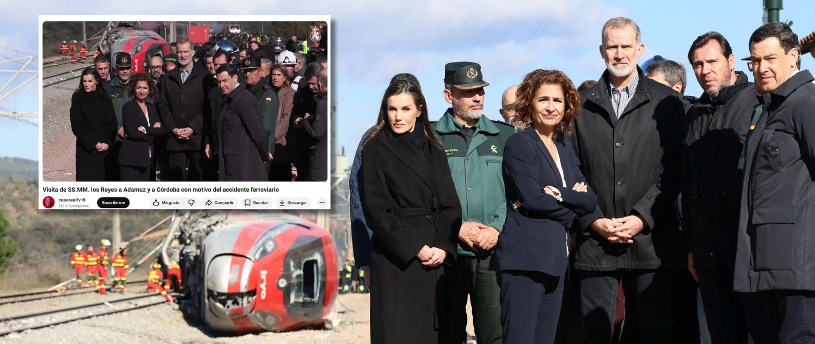 La foto en la que aparecen los Reyes, Felipe VI y Letizia, la vicepresidenta María Jesús Montero y el ministro de Transportes, Óscar Puente, junto al tren Iryo que descarriló en Adamuz (Córdoba) es real, la distribuyó la Casa Real y se puede encontrar en su página web oficial. Sobre si se trata de una imagen posada o no (como han asegurado algunos usuarios), en el vídeo publicado por la Casa Real de la visita al sitio del accidente, podemos ver que en el momento de la foto Puente está hablando, apunta en la dirección que están mirando y luego se mueven [min. 0:04:35]. No se ponen a “posar para la foto”.
