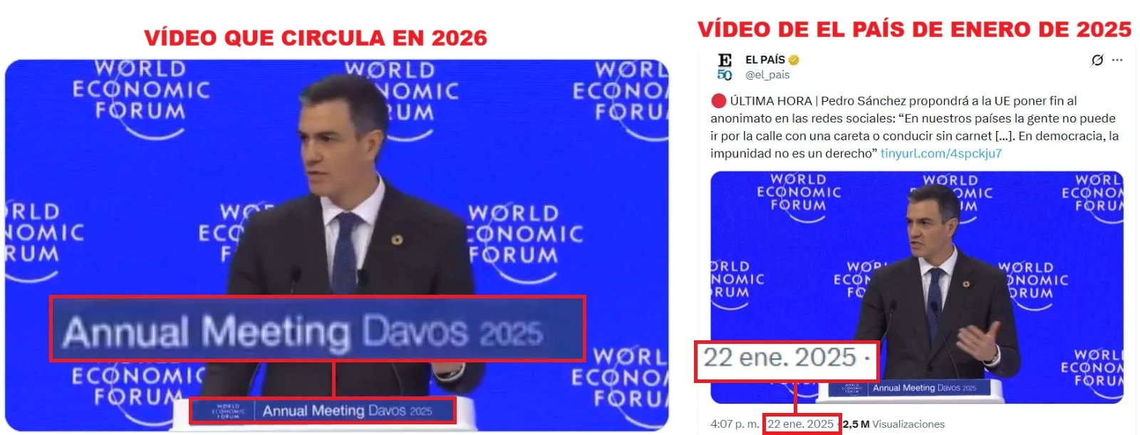 El vídeo no es actual, sino de enero de 2025. En el clip que circula se puede ver la fecha en el atril tras el que habla Pedro Sánchez: “Annual Meeting Davos 2025”. Además, El País compartió el mismo fragmento que se está compartiendo ahora el 22 de enero de 2025, en el que el presidente del Gobierno habla de “poner fin” al anonimato en redes sociales. Sánchez anunció el 19 de enero, un día después del accidente en Adamuz (Córdoba), que cancelaba su participación en el Foro de Davos prevista para el martes 20 de enero.