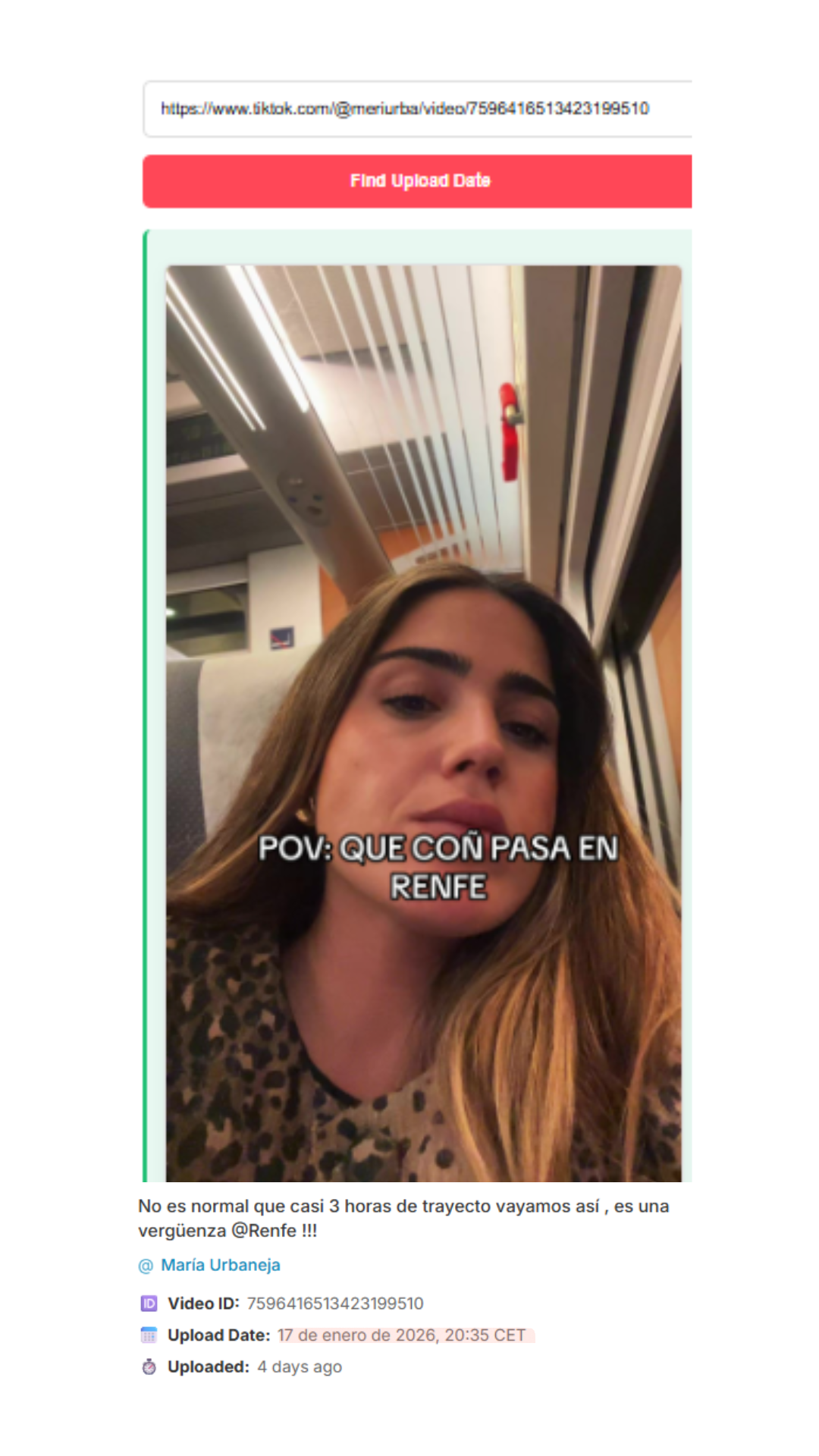 Este vídeo se publicó el sábado 17 de enero de 2026 a las 20:35, un día antes del accidente ferroviario de Adamuz del 18 de enero. La usuaria que lo publicó en TikTok denunciaba “las condiciones del viaje” de un tren de Renfe durante las “casi tres horas de trayecto” entre Málaga y Madrid del sábado 17 de enero por la noche. Lo que no sabemos es el tramo exacto donde se grabó.