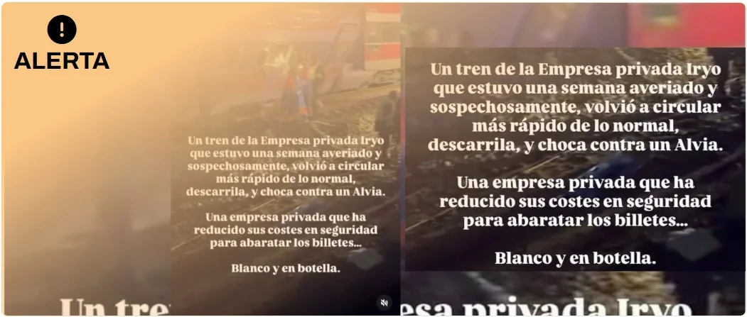 Este vídeo es de 2020, y no actual ni relacionado con el accidente de enero de 2026, como indican algunos contenidos. Tampoco hay ninguna prueba de que sea el tramo de Adamuz, como indica Grok, la IA de Twitter. Lo publicó un vecino de Huelva en el grupo de Facebook "Plataforma para la llegada de la Línea de Alta Velocidad a Huelva" denunciando “el viaje de vaivén, de lado a lado” del trayecto de Huelva a Madrid en un tren Alvia, sin especificar el tramo. Maldita.es ha enviado consulta a Adif para conocer más detalles, sin respuesta a 20 de enero de 2026.