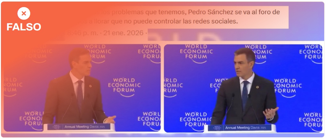 El vídeo no es actual, sino de enero de 2025. En el clip que circula se puede ver la fecha en el atril tras el que habla Pedro Sánchez: “Annual Meeting Davos 2025”. Además, El País compartió el mismo fragmento que se está compartiendo ahora el 22 de enero de 2025, en el que el presidente del Gobierno habla de “poner fin” al anonimato en redes sociales. Sánchez anunció el 19 de enero, un día después del accidente en Adamuz (Córdoba), que cancelaba su participación en el Foro de Davos prevista para el martes 20 de enero.