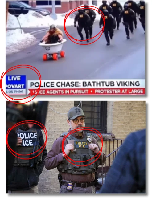 Lo mismo sucede en otro vídeo creado con IA donde agentes de ICE persiguen a un hombre vestido de vikingo que huye en una bañera con ruedas: lo compartió originalmente un usuario llamado StrangeAI (IA extraña, en español). Además de los errores en los uniformes, hay otros indicios de su origen sintético, como que no hay rastro de que exista un noticiario llamado “LIVE POVART” y hay errores en cómo está escrita la hora (dice 4:06 PHM, en lugar de 4:06 PM).