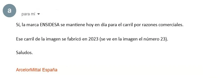 Óscar Puente, ministro de Transportes, también había dicho en un tuit que “Ensidesa es la marca comercial de Arcelor Mittal para todo el carril que fabrica, con independencia del año de fabricación”.