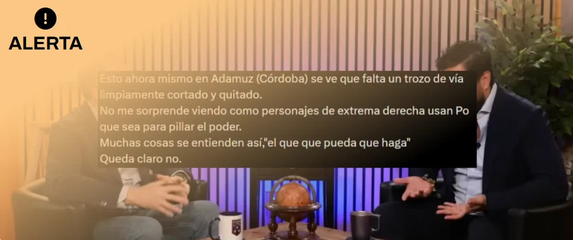 Varios mensajes relacionan sin pruebas este vídeo con la posibilidad de que lo ocurrido en Adamuz sea consecuencia de un sabotaje, algo sobre lo que a 27 de enero no hay indicios.