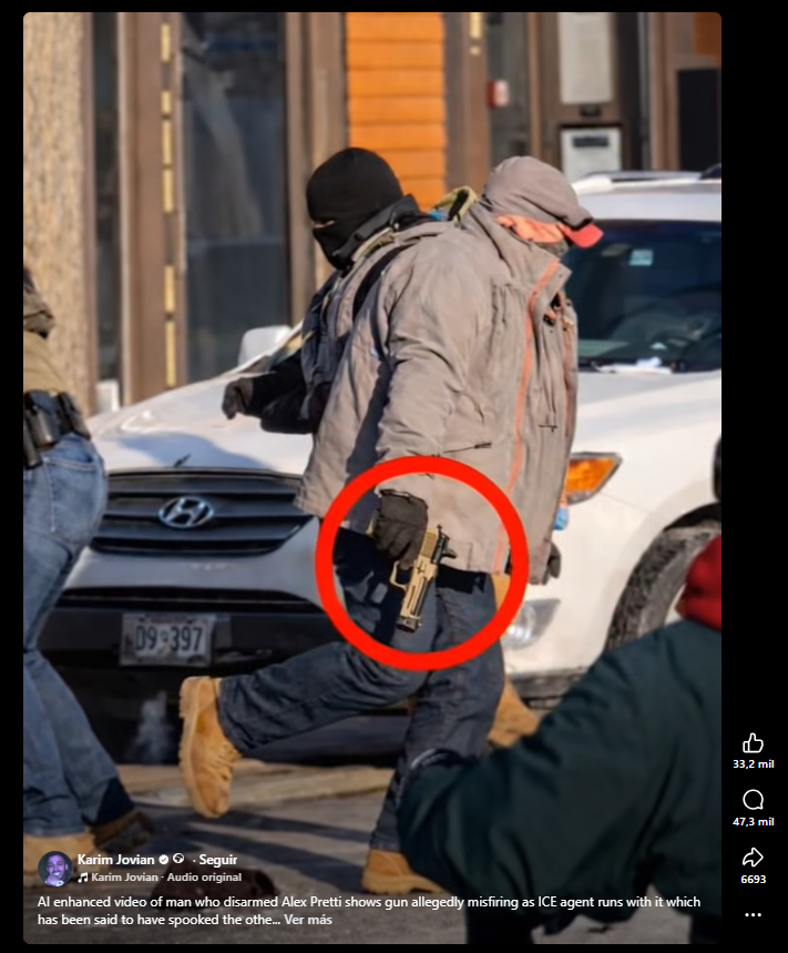No es el único contenido “mejorado con IA” que circula sobre los hechos: un vídeo que supuestamente muestra cómo el arma de Pretti se dispara en manos de un agente de chaqueta gris que se la quitó también ha sido editado con IA. Según la búsqueda inversa de Google, fue publicado originalmente por un usuario de Facebook que se define como “AI filmmaker” (director de cine con IA, en español), quién describió el vídeo como “mejorado con IA”.