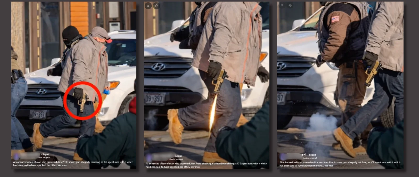 Este vídeo que supuestamente muestra cómo el arma de Alex Pretti, el hombre asesinado en Minnesota por agentes de la Patrulla Fronteriza, se dispara en manos de un agente de chaqueta gris que se la quitó ha sido editado con IA. Según la búsqueda inversa de Google, fue publicado originalmente por un usuario de Facebook que se define como “AI filmmaker” (director de cine con IA, en español), quién describió el vídeo como “mejorado con IA”.