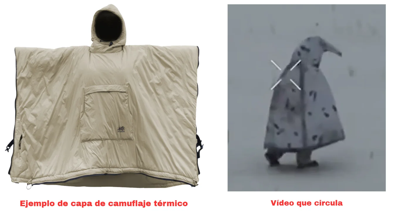 El material de estas capas, explica el experto, busca retener el calor corporal dentro del traje y reflejar la temperatura fría del exterior: “La idea es que, para la cámara del dron, el soldado tenga la misma temperatura que la nieve y se vuelva invisible”. Para que sea eficaz, “la capa debe ser holgada y cubrir desde la cabeza hasta los tobillos, ocultando la forma de los hombros, la cabeza y las extremidades”, dice Estévez. De este modo, “al eliminar la forma humana reconocible, se busca confundir a los algoritmos de detección y al ojo del operador del dron”, añade. Esto hace, dice, que la forma se asemeje a la de un pingüino.