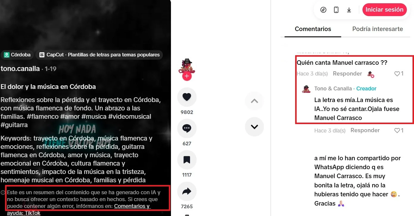 Esta canción que habla sobre el accidente de tren de Adamuz no es de Manuel Carrasco. Fue publicada por primera vez el 19 de enero de 2026, al día siguiente del accidente, en la cuenta de TikTok @tono.canalla. En la propia publicación aparece la etiqueta de “contenido que se ha generado con IA” y en los comentarios, un usuario pregunta si quien canta es Manuel Carrasco, a lo que @tono.canalla responde: “La letra es mía. La música es IA…Yo no sé cantar. Ojalá fuese Manuel Carrasco”. Además, la voz no se parece a la de Carrasco y el cantante no ha publicado ninguna canción referente a Adamuz en sus redes sociales.