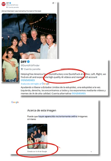 La cuenta detrás de esta imagen ha publicado varias similares, también creadas con IA, que se están utilizando para vincular al alcalde y a su madre, la cineasta Mira Nair, con Epstein, incluso con mensajes que insinúan que Mamdani sería el hijo del magnate convicto.