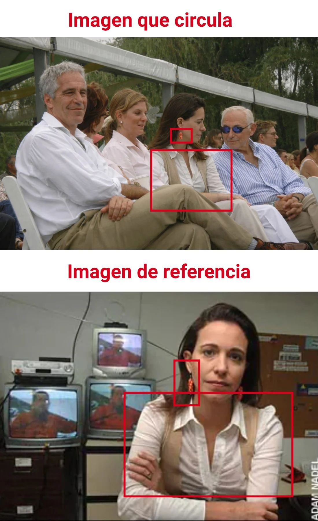 De acuerdo con Cazadores de Fake News, miembros de la International Fact-Checking Network (IFCN), al igual que Maldita.es, la imagen que tomaron de María Corina Machado para integrarla junto a Epstein sería una publicada por The Telegraph en la que se la ve con la misma ropa y aretes. También afirman que el montaje se hizo con inteligencia artificial generativa.