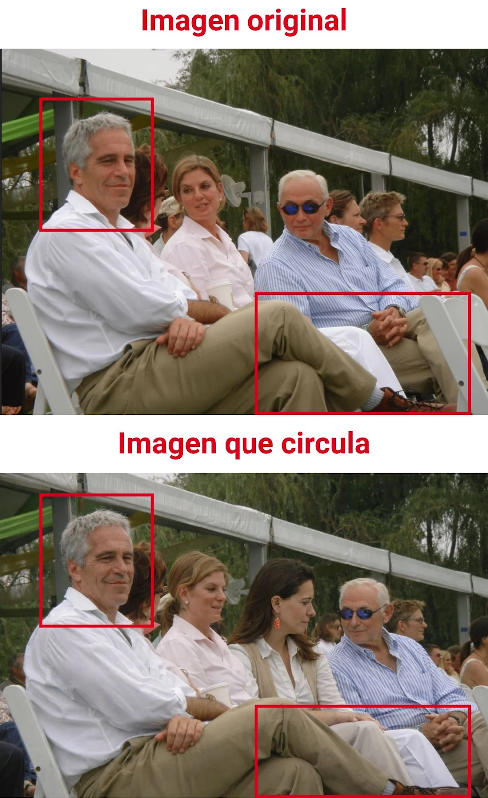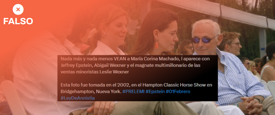 La imagen que muestra a María Corina Machado sentada a un asiento de distancia de Jeffrey Epstein no es real. Se trata de un montaje en el que han usado fotografías reales de 2022 y recientemente desclasificadas como parte del caso Epstein, publicadas por el Departamento de Justicia de EEUU, para crear una imagen en la que apareciera Machado. En las imágenes originales se ve a Epstein sentado junto a una mujer a la que se le ve la cara, a dos asientos del magnate Leslie Wexner y a uno de su esposa, Abigail Wexner, en un evento ecuestre en Ohio (Estados Unidos), según la documentación. En ninguna de las imágenes publicadas por el Gobierno estadounidense sale la líder opositora venezolana María Corina Machado. Al comparar las imágenes se puede notar a Leslie Wexner en la misma postura y que quien parece usar un pantalón blanco es Machado, pero en las originales la de ese pantalón es Abigai Wexnerl.