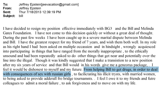 En el segundo correo, una hora después de redactar el anterior, comienza diciendo que dimite de su posición del think tank BG3 y de la Fundación Gates porque “en las últimas semanas” se ha visto “envuelto en varias disputas matrimoniales entre Melinda y Bill”. A continuación, enumera las cosas que hizo por Bill, como ayudarle a “conseguir medicamentos para lidiar con las consecuencias de mantener relaciones sexuales con chicas rusas”.
