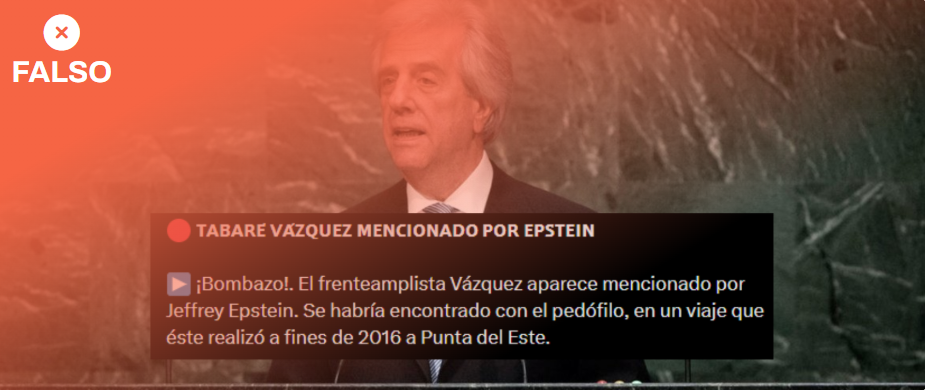 Tabaré Vázquez es otro expresidente uruguayo del cual aseguran que tuvo relación con Epstein y que aparece entre los contenidos desclasificados hasta enero de 2026. En la publicación de redes sociales afirman que ambos se reunieron en 2016, pero en la captura del documento que se comparte no aparece Vázquez, sino el peluquero argentino Leonardo Roberto Giordano. Además, el exdirigente solo aparece mencionado como ejemplo en unos emails entre Epstein y el Sultán Ahmed bin Sulayen de 2011 en el que dice que el príncipe Al Waleed se ha reunido con varias personalidades relevantes. Entre estas, aparece Tabaré Vázquez junto a otros conocidos, como el Papa Benedicto XVI y el expresidente francés Nicolás Sarkozy.