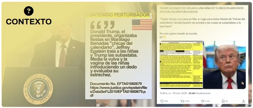 El 30 de enero de 2026 el Departamento de Justicia de Estados Unidos publicó más de 3 millones de documentos sobre el caso Epstein que se suman a otros ya desclasificados. En Twitter (ahora X) han compartido capturas de uno de estos documentos en el que se recoge un testimonio de una víctima que asegura que Trump organizaba fiestas llamadas “chicas de calendario” en las que “Epstein traía a las niñas” y el presidente de EEUU “las subastaba”. El documento es real: son declaraciones no verificadas de presuntas víctimas recogidas a través de una línea anónima del FBI y que ya no están publicadas en la página web del Departamento de Justicia de EEUU.