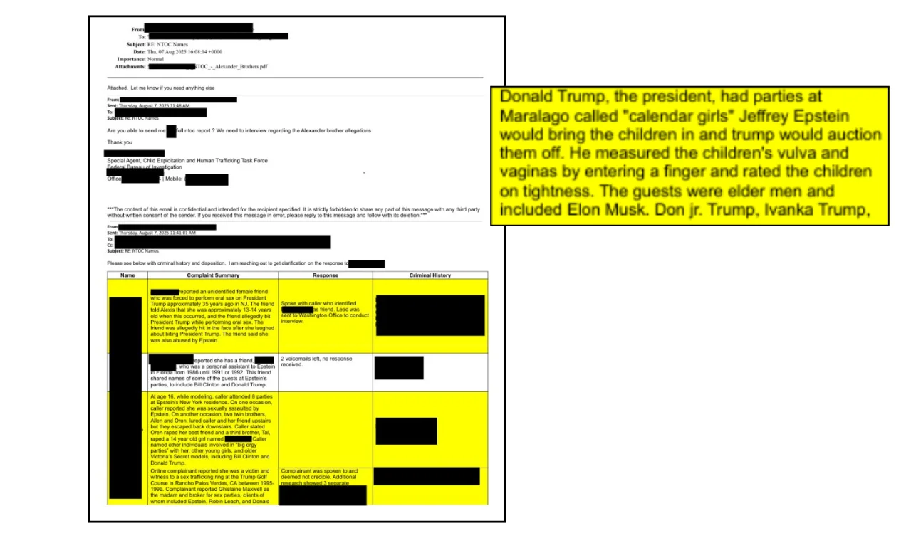 El documento al que se refieren los contenidos es un correo electrónico de agosto de 2025 que ya no aparece publicado en la biblioteca de documentos desclasificados del Departamento de Justicia de EEUU. En la página 3 y 6 de la versión archivada se recoge un testimonio que expone que Donald Trump “organizaba fiestas en Maralago” (sic) llamadas “chicas de calendario”. Tal y como dice la denuncia, Jeffrey Epstein “traía a las niñas y Trump las subastaba” y les medía “la vulva y la vagina introduciendo un dedo”.