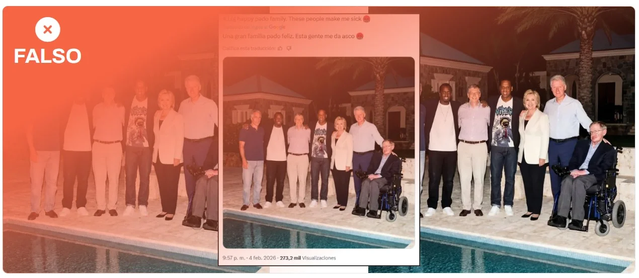 Esta imagen que supuestamente muestra a Jeffrey Epstein posando en una foto junto al rapero Puff Diddy, Bill Gates, Jay-Z, Hillary y Bill Clinton y Stephen Hawking no es real. Se trataría de una imagen generada con inteligencia artificial. La instantánea muestra varios errores habituales en los contenidos creados con IA: los dedos de la mano de Stephen Hawking están cortados y los ojos de Jeffrey Epstein aparecen borrosos. Tampoco aparece el reflejo de todos los cuerpos en la piscina que se encuentran delante de ellos. Además, si nos fijamos en la imagen, los rostros de Bill Gates y Hillary Clinton no tienen nitidez.
