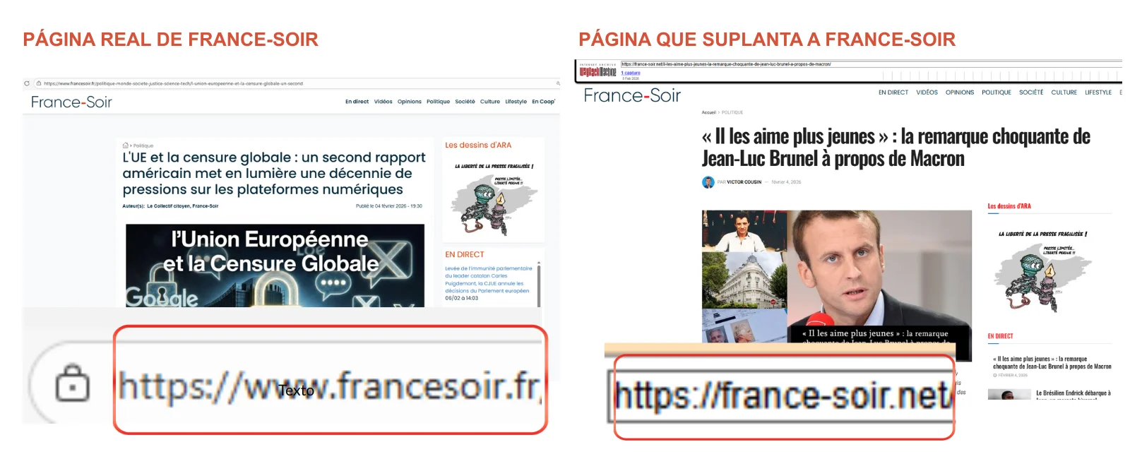 France-Soir no ha publicado un artículo con el titular “'Le gustan más jóvenes': la impactante declaración de Jean-Luc Brunel ―agente de modelos francés acusado de colaborar con Epstein ―sobre Macron”, relacionando al presidente de Francia con una supuesta aparición en los documentos del magnate, por la organización de una fiesta y jóvenes. Se trata de una página que ya no está disponible y que se hace pasar por France-Soir, como ellos mismos han denunciado en Twitter (ahora X), donde afirman que la web “france-soir.net no está administrada por el equipo de France-Soir y no está autorizada” a utilizar su marca “para engañar a los lectores”. La URL de la página que la suplanta es france-soir.net, mientras que la original es francesoir.fr. El periodista que aparece en la página que se hace pasar por France-Soir firmando el artículo de las acusaciones a Macron es Víctor Cousin, que realmente trabaja para Le Parisien, donde ha afirmado que “se trata de acusaciones completamente falsas que implican robo de identidad”.