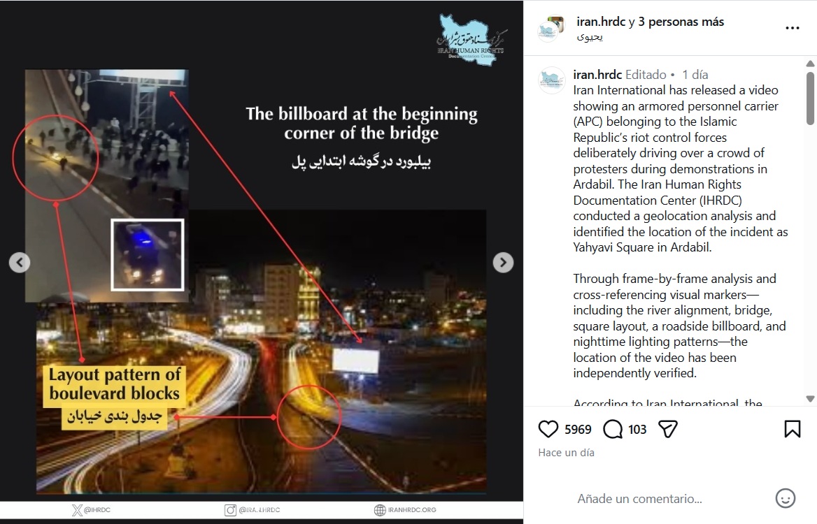 Este vídeo de un vehículo policial atropellando a las personas que se encuentran por su paso es real, pero no está grabado en Estados Unidos, sino en Irán. Los mensajes que comparten la grabación aseguran que son las “fuerzas de seguridad de Donald Trump” intentando persuadir “una manifestación en contra del ICE”, pero las imágenes se registran en la ciudad iraní de Ardabil en enero de 2026. Iran Internacional publicó una versión más amplia del vídeo afirmando que se trata de un “vehículo blindado operado por las fuerzas de seguridad iraníes” atropellando a un grupo de manifestantes “durante las protestas del 8 y 9 de enero en la plaza Yahyavi”. El Centro de Documentación de Derechos Humanos de Irán ha verificado y geolocalizado la ubicación exacta.